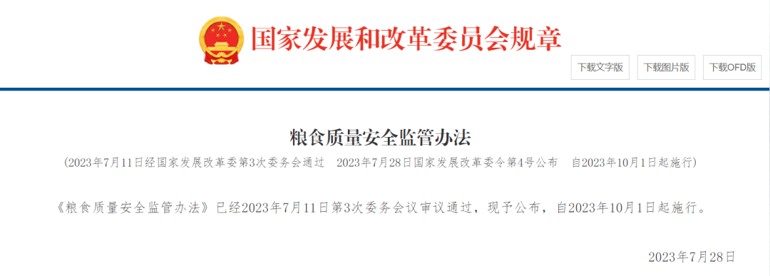 近日,国家发展改革委根据《粮食流通管理条例》等法律法规,制定《粮食质量安全监管办法》,以保护粮食生产者积极性,维护粮食经营者和消费者合法权益,加强粮食流通领域质量安全监督管理,保障国家粮食质量安全。